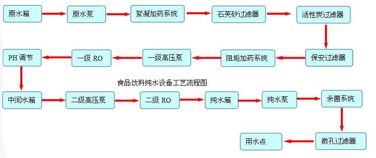 in the food and beverage industry, water is usually used to pre process water or pure water, and the electrical conductivity is usually below 10us/cm. With the aggravation of global pollution and people's pursuit of health, the food and beverage industry has put forward more stringent requirements. Ordinary municipal tap water or underground deep well water has been difficult to meet the needs of people. Now, the management of food and beverage industry has gradually formed a comprehensive control system, such as the establishment of the enterprise, the production process, the finished product inspection and so on. Now many food and beverage industry to implement the food hygiene and safety license system (QS certification), the provisions of the process water and finished water are required to use the purified water, usually pure water。
